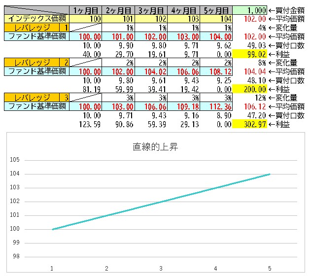 このケースでも、レバ3倍が買付口数が一番少なかったにもかかわらず、一番利益が出ています。このパターンでは、ほぼレバレッジに沿ったパフォーマンスが出ています。このような場面では、レバ積立が本領を発揮できます。