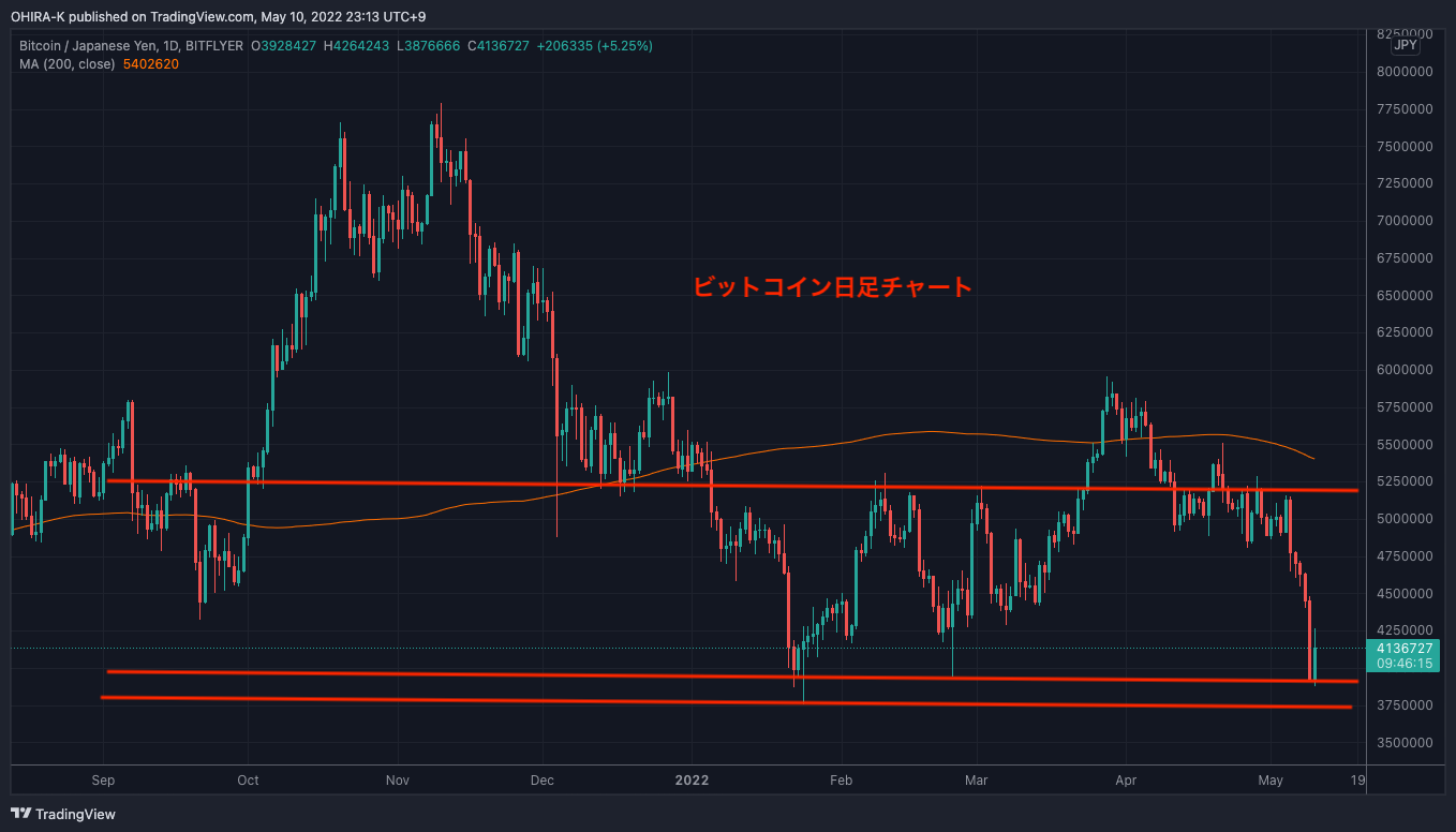 先週の記事ではビットコインはレンジ相場にあるとお伝えしていましたが、5月5日から大きな下落が発生し、5日連絡陰線を記録、BTCJPYの円建てのビットコインは現在今年3月下旬に記録した380万円で一度跳ね返りました。