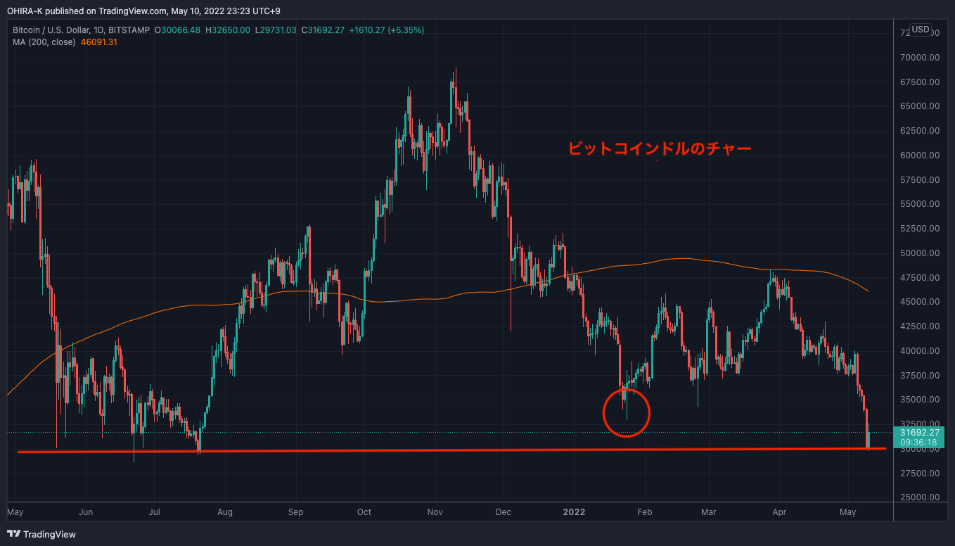 ビットコインドルは、今回の下落で今年1月の最安値を下回っているのがわかると思います。(チャートの赤丸)