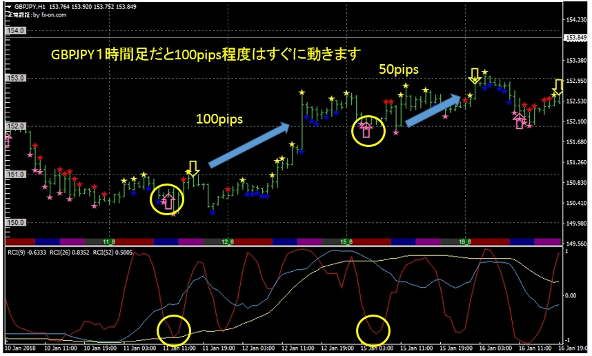 時間足は何分でも構いませんが、1時間足だと値幅を大きくとることができます。