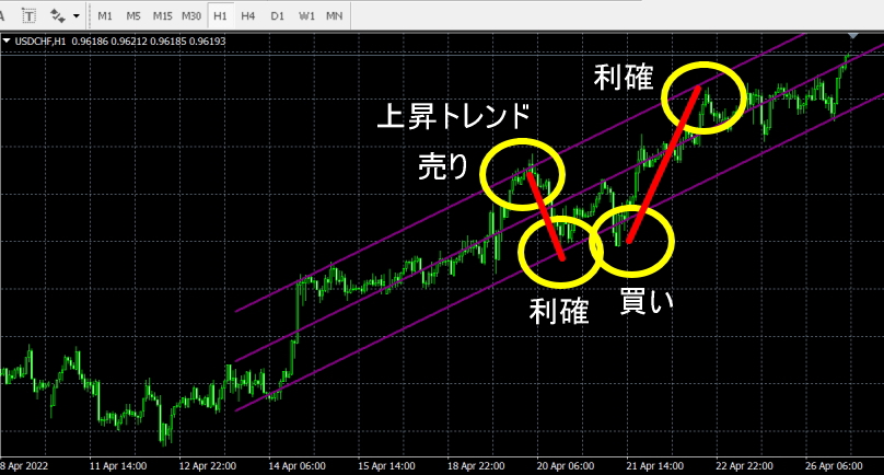 下降トレンドですので、チャネルラインの上端とミドルラインで売って、チャネルラインのミドルラインと下端で利確しました。
