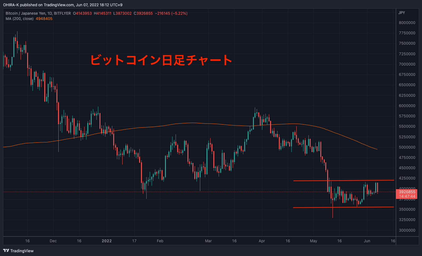 相変わらずビットコインは直近の410万円ー360万円のレンジ相場で価格が行き来している状況です。