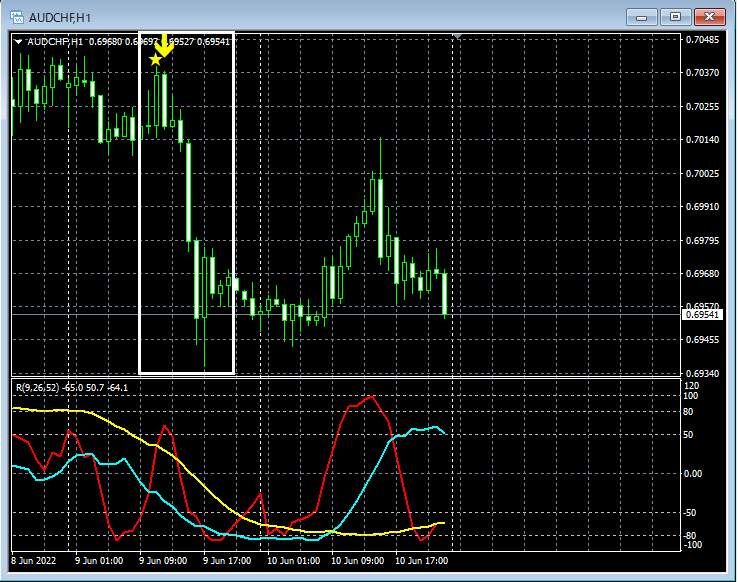 1時間足では、mBDSRの戻り売りサイン(RCI2本フィルター)の戻り売りサインが点灯し下げています。