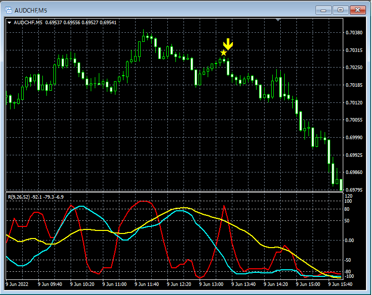 1時間足で戻り売りサインが点灯しているあたりを5分足で詳しく見てみると、三尊を形成して下げています。結果として三尊の右肩でmBDSRの戻り売りサイン(RCI2本フィルター)の点灯して下げる形となっています。