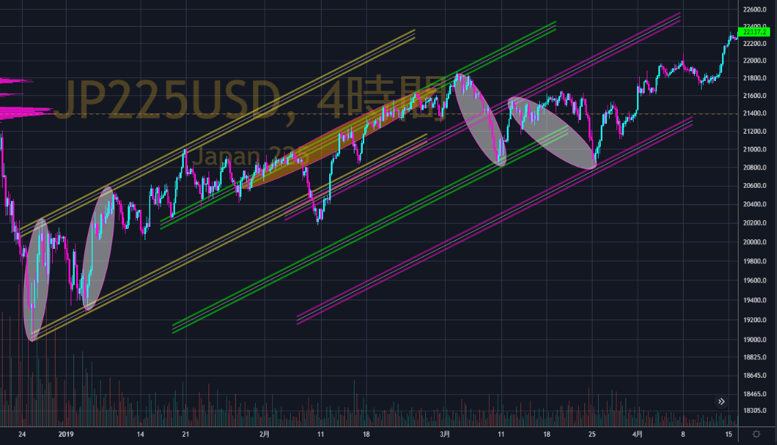 ⑤戻りを見せたのでそのポイントに再度チャネルを平行移動してみました。(ピンクチャネル)