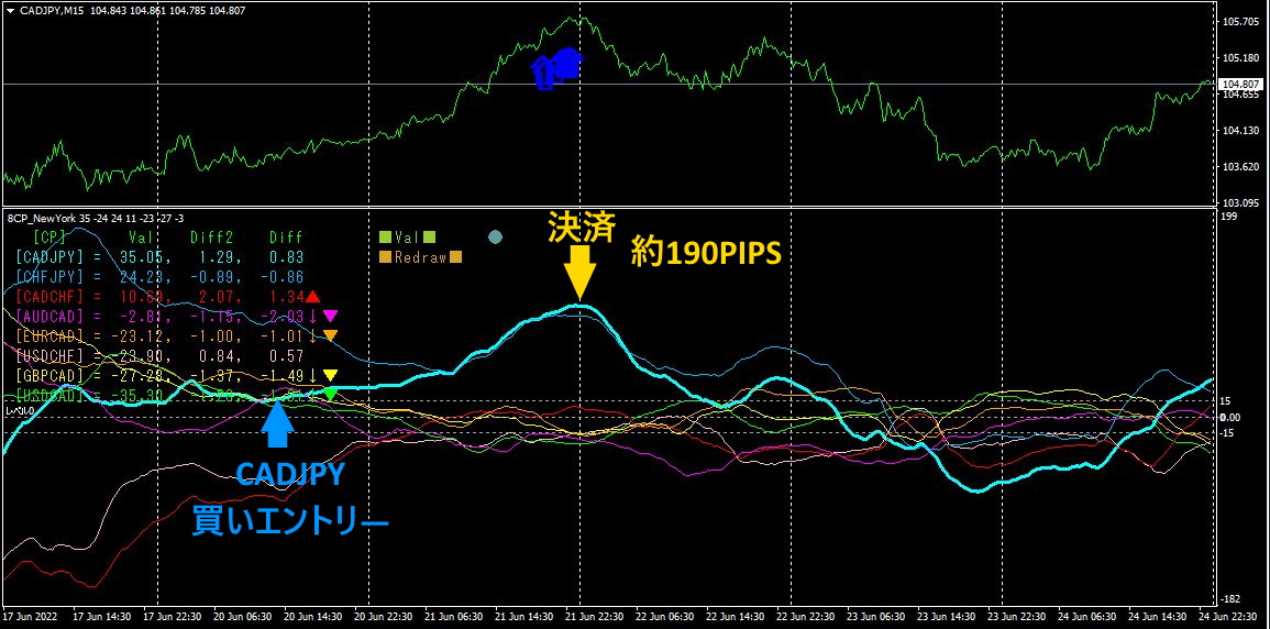 上半分は、CADJPYの15分足チャートです。上半分の青色矢印は、「28通貨ペア一覧インジケータ」のアラート位置を示します。下半分は、「8CP見える化インジケータ」です。水色太線のグラフがCADJPYに相当します。