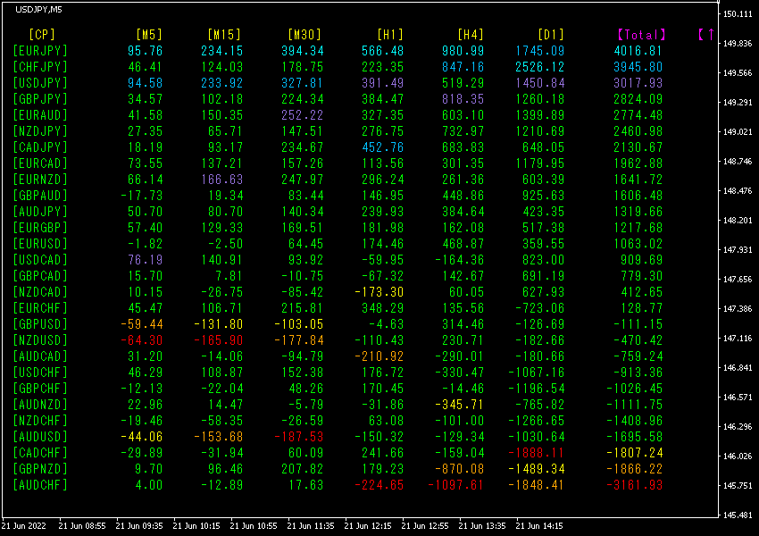 一番上の行にあるEURJPYが、[M5]、[M15]、[M30]、[H1]、[H4]、[Total]が全て水色表示になっています。強い上昇トレンドにあることを示しています。
