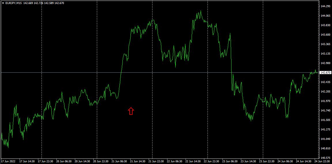 チャートを見ていて、直近高値越えから買いエントリ―したとすれば、約150PIPS以上の利益になった場面です。