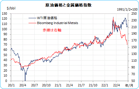 Bloomberg Industrial Metals指数は、aluminum, copper, nickel and zincで構成される工業金属価格指数である。急速に軟化している。供給サイドにも問題はあるが、需要がそれ以上に細るという観測なのだろう。つまり、景気の急減速を市場は見ている。