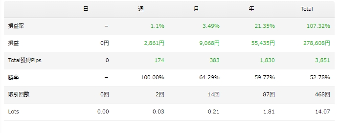 勝率を見ると50%以上を保っていて、TP87pips、SL80pipsなので勝率が50%を切らない限りは利益が残っていくというロジックです。