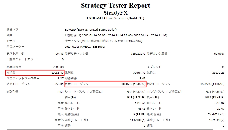 バックテストから見ると、最大ドローダウンは1828ドルとなっており、