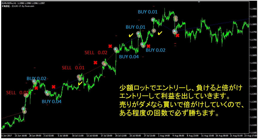 普通のナンピンと違うのは、ずっと同じ買いだけ、ではなく、買いでまけたら売りで倍がけ、としていくところです。