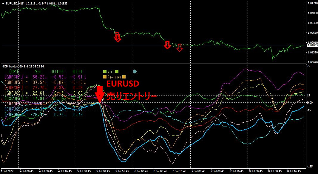 上半分は、EURUSDの15分足チャートです。上半分の赤色矢印は、「28通貨ペア一覧インジケータ」のアラート位置を示します。下半分は、「8CP見える化インジケータ」です。水色太線のグラフがEURUSDに相当します。