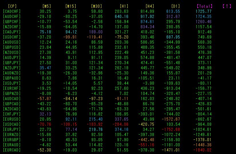 USDCADの、[M5]、[M15]、[M30]、[H1]が赤色表示になっていますが、Total数値が低すぎます。今週は、目立ったアラートが発生しませんでした。
