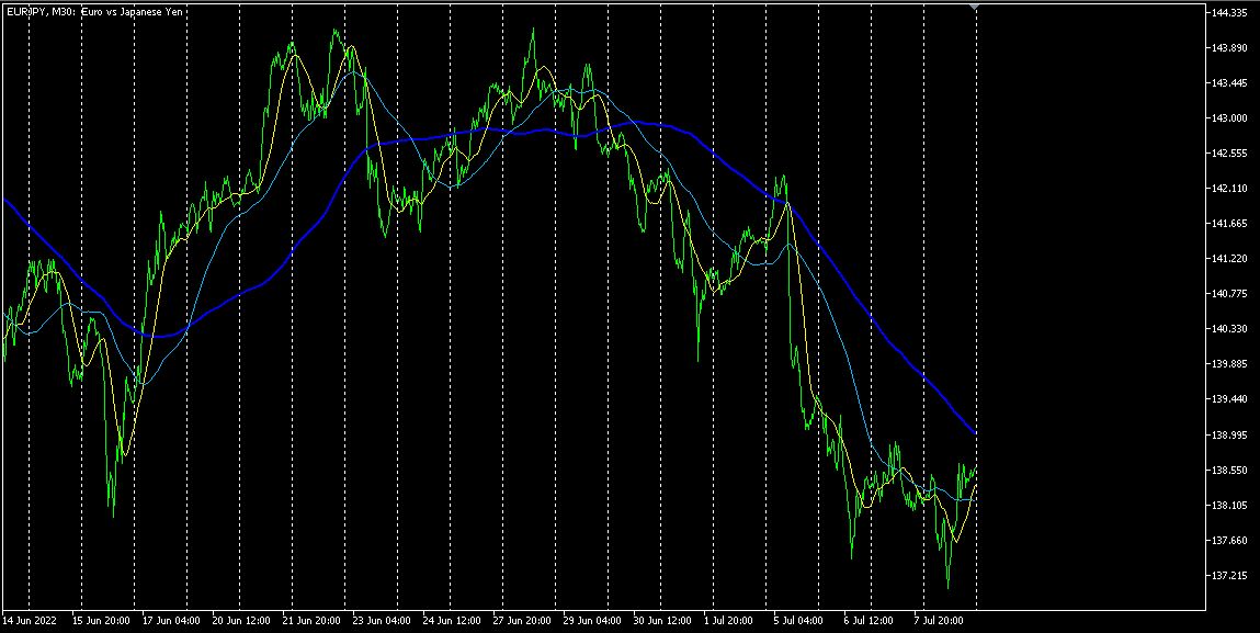 火曜日にEURUSDが他のグラフ群を下に抜けて急落してきたので、売りでエントリーします。当日の夜に、グラフの底で決済すれば約150PIPSの利益が、週末まで保持すれば、約300PIPSの利益が得られました。