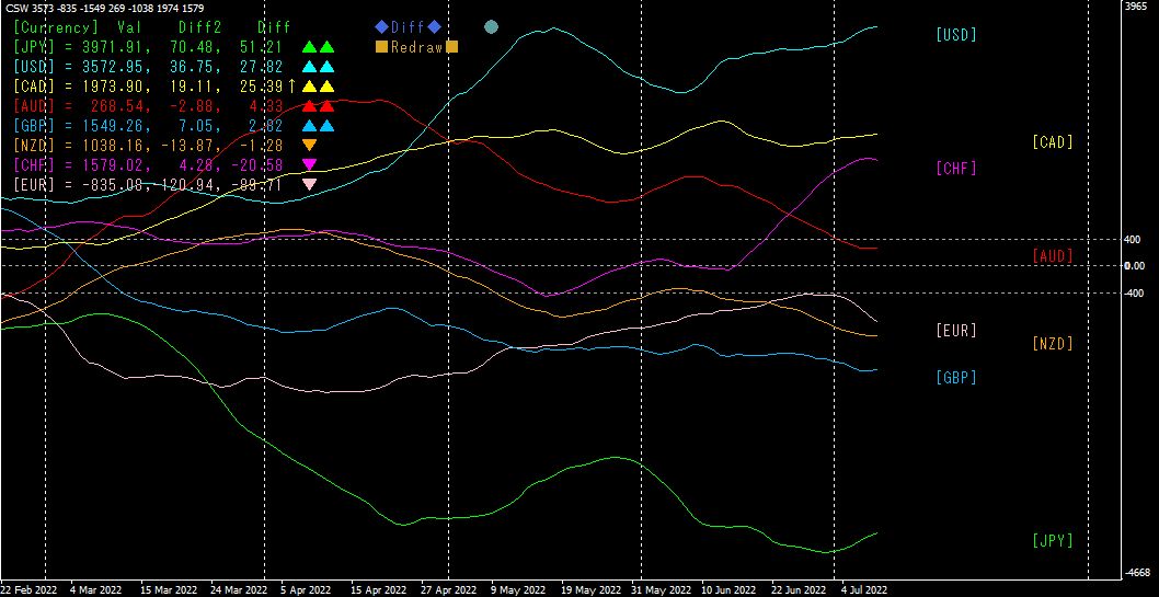 先週に比べて、EURのグラフは下向きに、JPYのグラフは上向きになっています。変化率をみるとプラスの最大がJPYであり、EURはマイナス最大です。特にEURのグラフが急角度で低下しています。日足の通貨強弱の流れから見れば、EURJPYが下落方向にあると言えます。