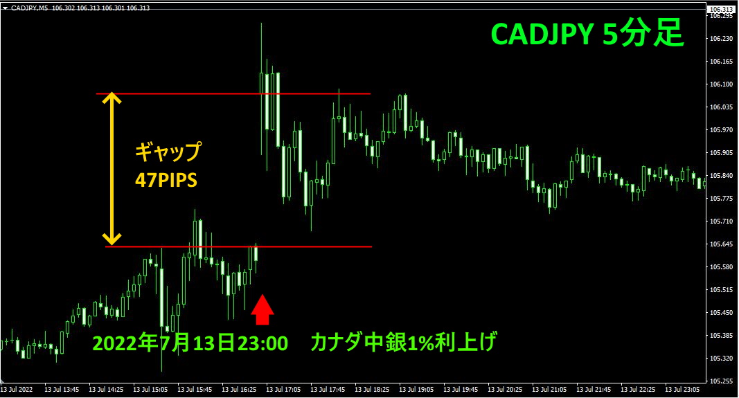 利上げ発表により、乱高下し、チャートに47PIPSのギャップ(窓開け)が発生しています。