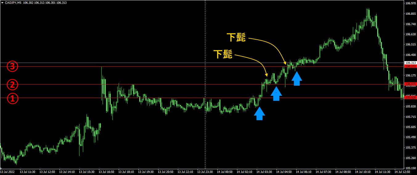利上げ後は、上に伸びることが分かっているので、①、②、③のレジスタンスラインを抜けた所で、買いエントリ―します(水色矢印)。チャートパターンとして長い下髭が2か所出ているのも、上への買い圧力が強いことを示唆しています。