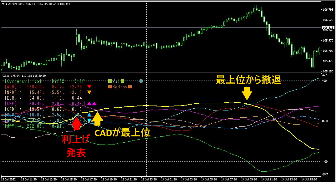 上半分が、CADJPYの15分足チャート、下半分が「8C通貨強弱見える化インジケータ」で描画したものです。黄色太線がCADのグラフです。利上げ直後から、CADが最も強い通貨に躍り出ています。翌日CADは最上位の座をUSDに譲って撤退しています。この間、JPY(緑色グラフ)は、一番下を走っています。