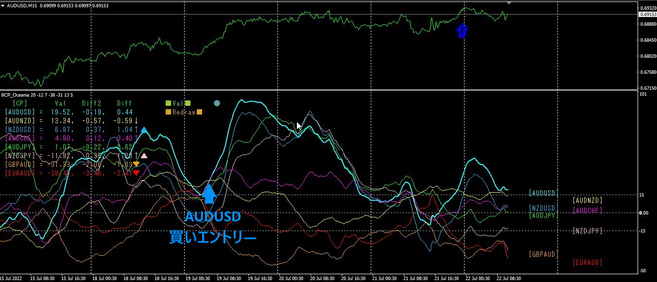 上半分は、AUDUSDの15分足チャートです。上半分の青色矢印は、「28通貨ペア一覧インジケータ」のアラート位置を示します。下半分は、「8CP見える化インジケータ」です。水色太線のグラフがAUDUSDに相当します。