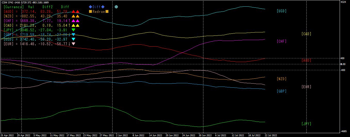 相変わらず、USDが最も強い通貨で、JPYが最も弱い通貨になっています。方向性としては、AUD、NZD、CHF、CADが上げ方向、JPY、GBP、USD、EURが下げ方向です。EURとJPYを比べた場合に、EURの下げが強いので、通貨強弱的には、EURJPYは下落方向に進むと見ることができます。