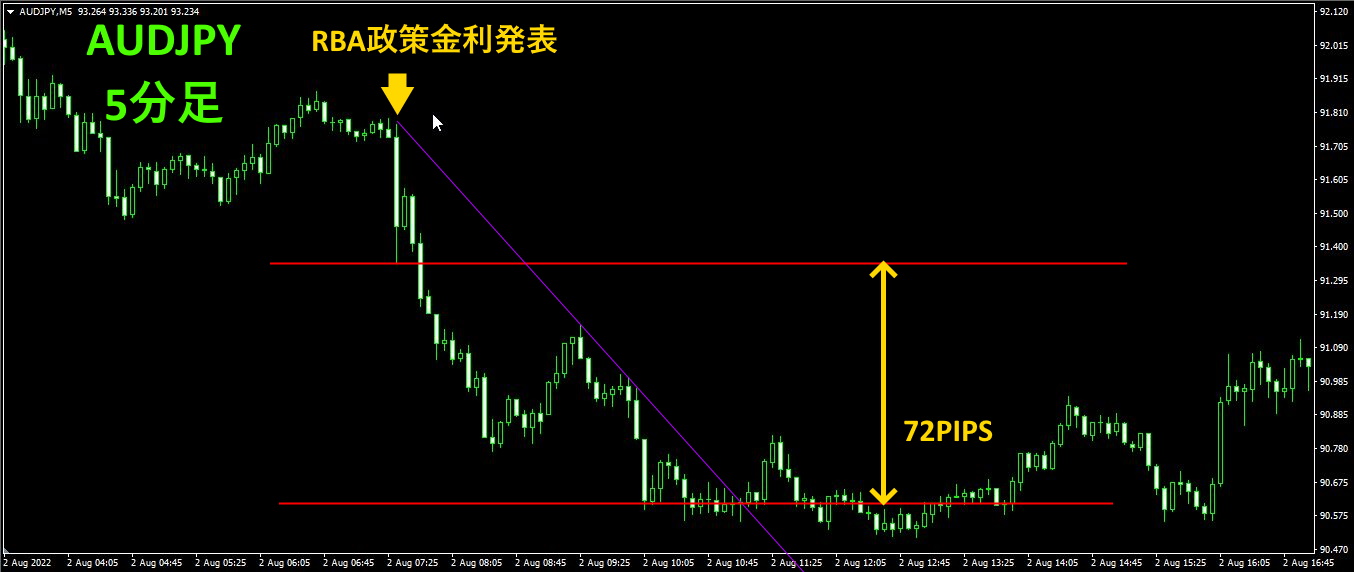 下の図は、政策金利発表当日のAUDJPYの5分足チャートです。