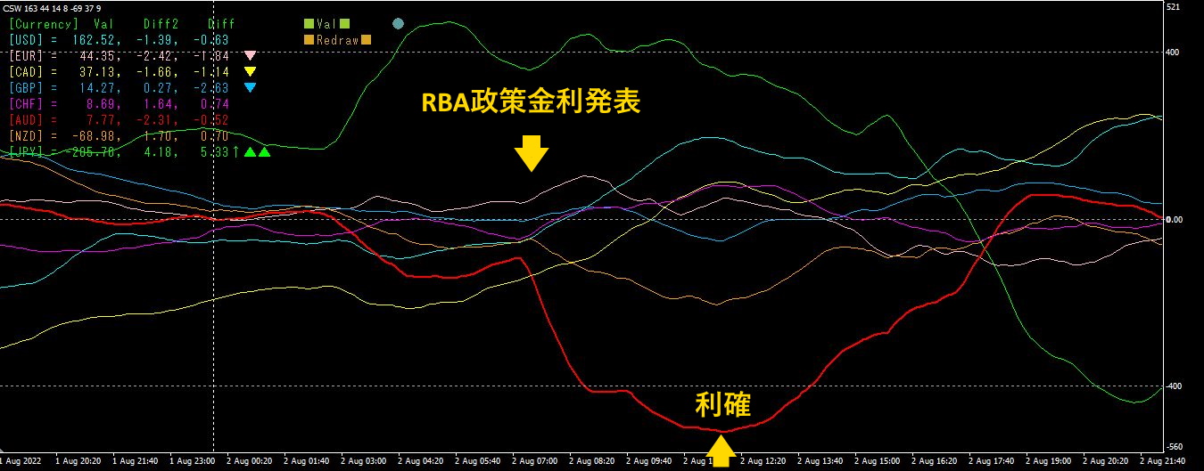 赤色がAUD、緑色がJPYのグラフです。政策金利発表直後から、AUDがストンと下がり、最も弱い通貨に下落しました。一方JPYは、この時点では最も強い通貨になっています。そこで、通貨ペアAUDJPYを売れば、「後出しじゃんけん」で利益になるわけです。通貨強弱でAUDのグラフが水平から上向きになったら利確します。
