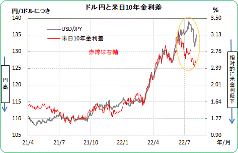 なお、ニュースを見ていると、一部の為替アナリストは、ドル/円相場と米日10年金利差から126円もという見方もあったようだが、「為替相場と金利差の関係は恒久的なものではない。しばしば形を変える」ので、その見方は重視しない方がいいと、何度も書いてきた。