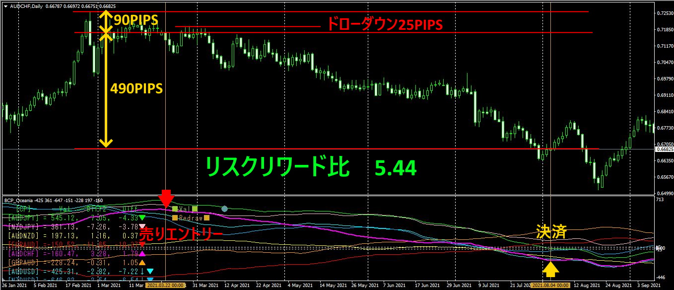 ドローダウンは25PIPSで、損切幅が90PIPS、利益幅が490PIPS、リスクリワード比5.44の王道のトレードが行えます。