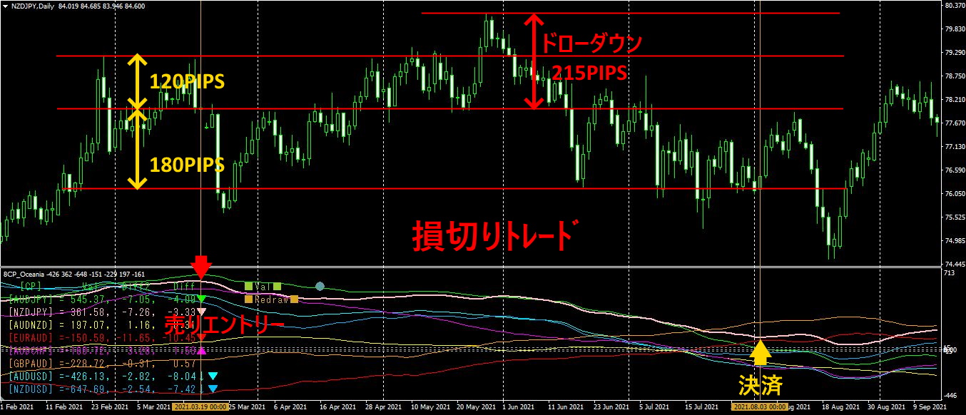 損切幅が120PIPSに対して、ドローダウンが215PIPSもあり、損切りトトレードになってしまいました。