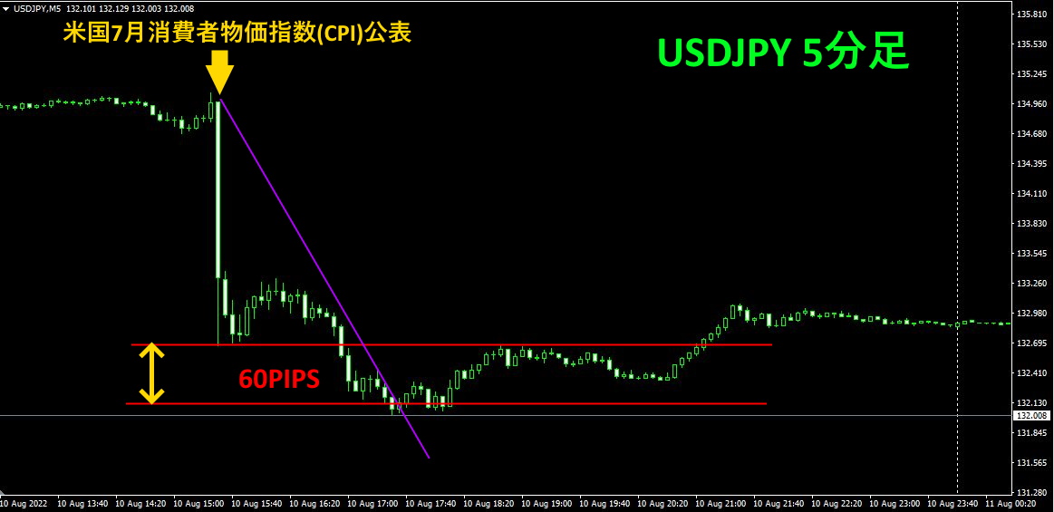 下の図は、消費者物価指数発表前後のUSDJPYの5分足チャートです。