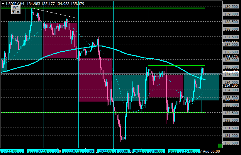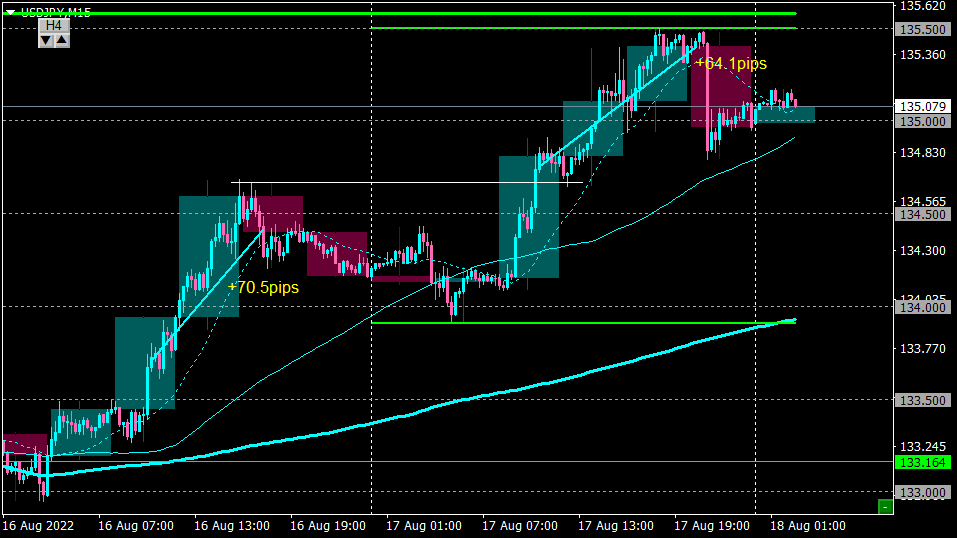 134.0付近での買いができなかったので、前日高値抜けでエントリーし週足高値の135.50までホールド。