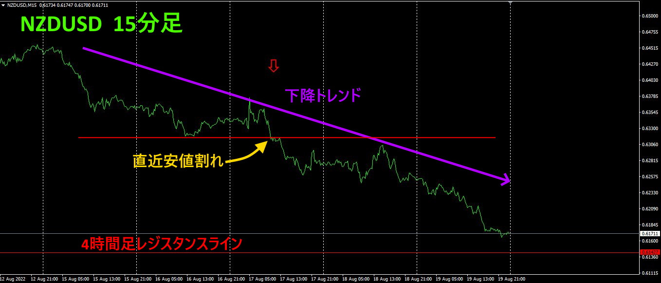 下向きの赤矢印がスクリーンショットを撮影した位置です。全体的に下降トレンド途中にあり、偶然にもスクリーンショット撮影位置で直近安値を割り込んでいます。但し、4時間足で引いたレジスタンスラインが近くにあるので、利益が出たら早めの決済というスタンスが必要でしょう。