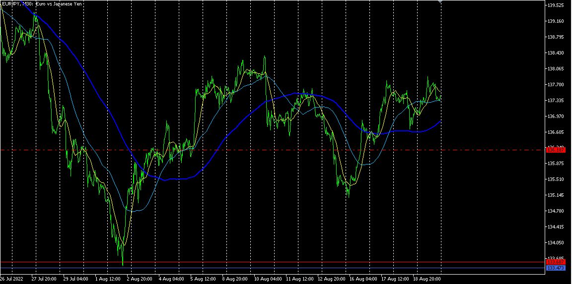 全体の流れを見るため、30分足チャートで直近約3週間分を描いています。