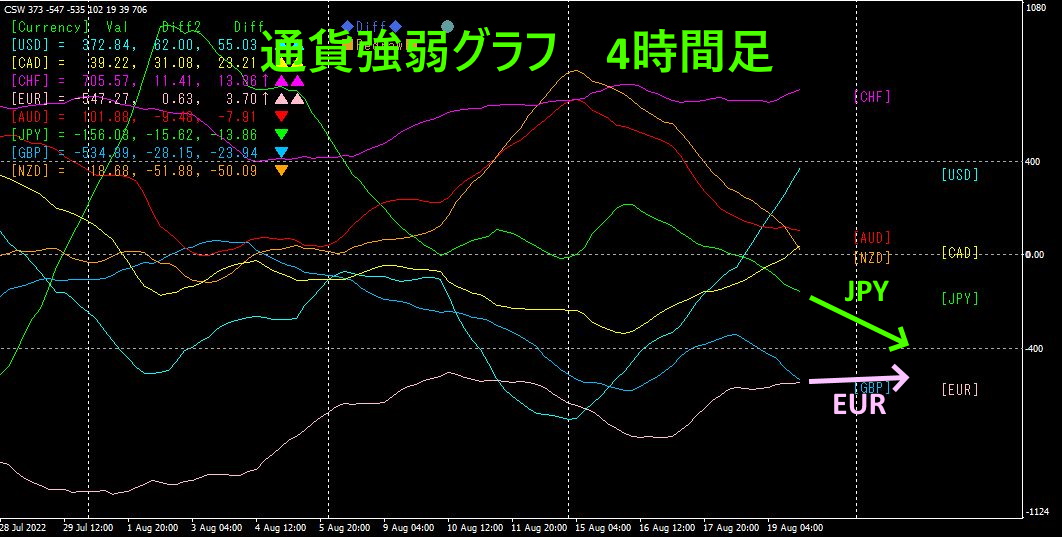 通貨強弱的には、JPYがEURよりも上にあるのでJPY>EURです。グラフの傾きや方向性を見ると、JPYが下向きに、EURはやや上向きになっています。結果としてEURJPYの通貨ペアは上昇することになります。