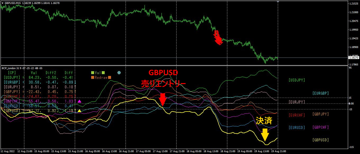上半分は、GBPUSDの15分足チャートです。上半分の赤色矢印は、「28通貨ペア一覧インジケータ」のアラート位置を示します。下半分は、「8CP見える化インジケータ」です。黄色太線のグラフがGBPUSDに相当します。