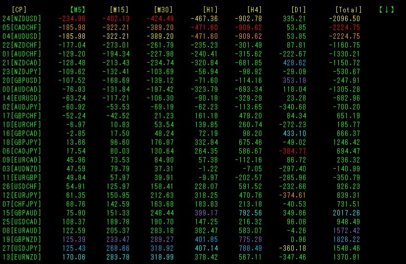 [M5]で昇順に並べ替えています。一番上の行にあるNZDUSDを見てください。[M5][M15][M30]が赤色表示で、[H1]が黄色表示です。[H1]が赤色表示ではないので、アラートの出現条件を満たしていません。しかし短期足3本が赤色表示で、下降トレンドの発生を示しているので、短期的なら売り仕掛けもありでしょう。