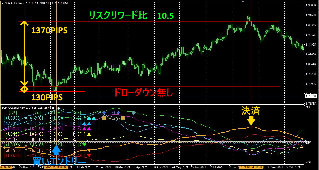約7か月間保有して、利益が1370PIPS得られました。買いエントリーしてから、一度も建値を割り込むことが無く、含み益をどんどん伸ばしてきました。直近安値をSLにした場合の損切幅が130PIPS、リスクリワード比が10.5のトレードとなりました。
