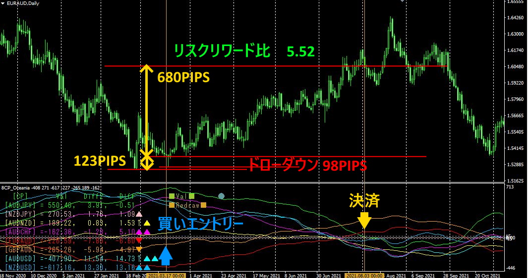 これも約5か月弱の保有で、利益幅が680PIPS得られました。エントリーした翌日の長い下髭で、最大ドローダウン98PIPSまで下がりましたが、SL設定が123PIPSにしておいたので、損切に掛かっていません。翌々日以降はずっと含み益を持った、リスクリワード比が5.52のトレードとなりました。