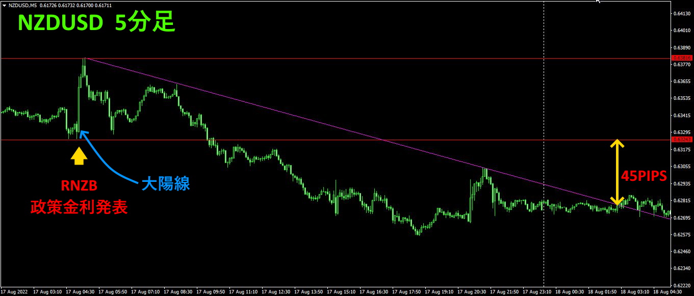 下の図は、発表前後のNZDUSDの5分足チャートです。