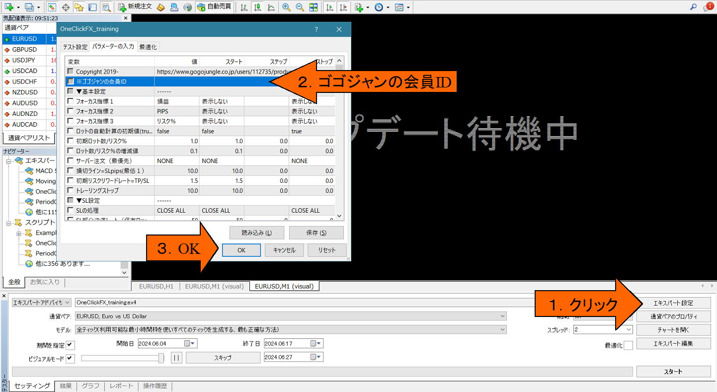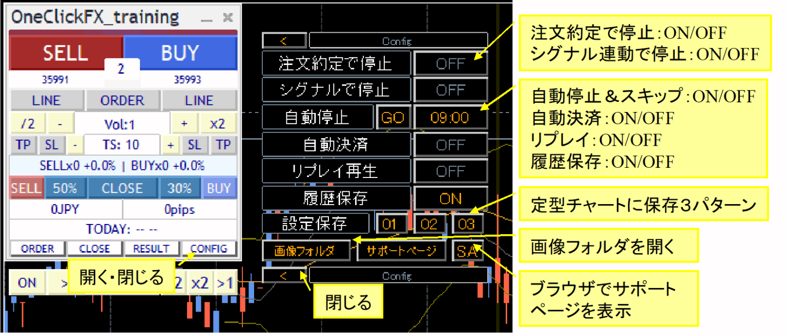 パラメタ設定画面の右下「読み込み」ボタンを押すとプリセット「OneClickFX_training_SPx.set」を適用することでも上記の設定となります。