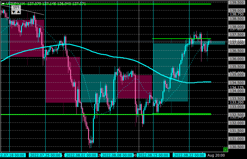 先週高値137.23あたりで比較的大きなWトップを作るようならショートを検討したい。