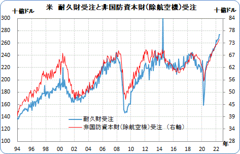 耐久財受注、コア資本財(非国防資本財から航空機を除く)受注とも順調に拡大している。(耐久財受注はごくわずか減少したが、前月大きく伸びた反動減)