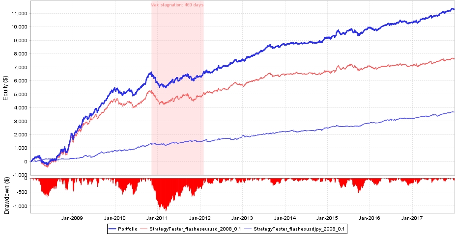ただし最大ドローダウンはEURUSDの方が5倍大きいので、ロット比率はEURUSD:USDJPYを1:5にしても良いですね。