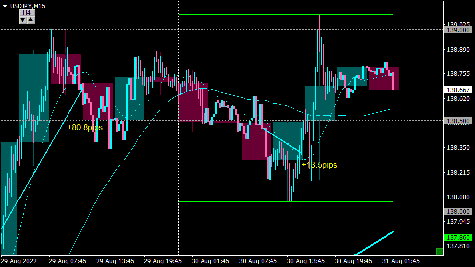 ただし上昇トレンド中のショートなので早めにイグジット。+13pips