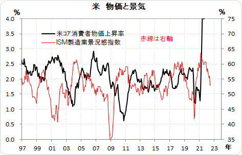 経済成長をISM指数で計る(ISM指数はGDP成長率と連動しているので)と、次のグラフに見るように、ISM指数が拡大しているときは、消費者物価上率は低下する。逆も真である。つまり、景気が減速しているとき(ISM指数が低下している時)は、消費者物価上昇率は上昇する。