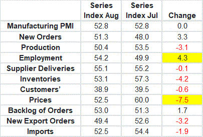 仕入れ価格指数は7月の60.0から52.5に大きく低下した。これは、主に商品価格の急落を反映しているのであろう。