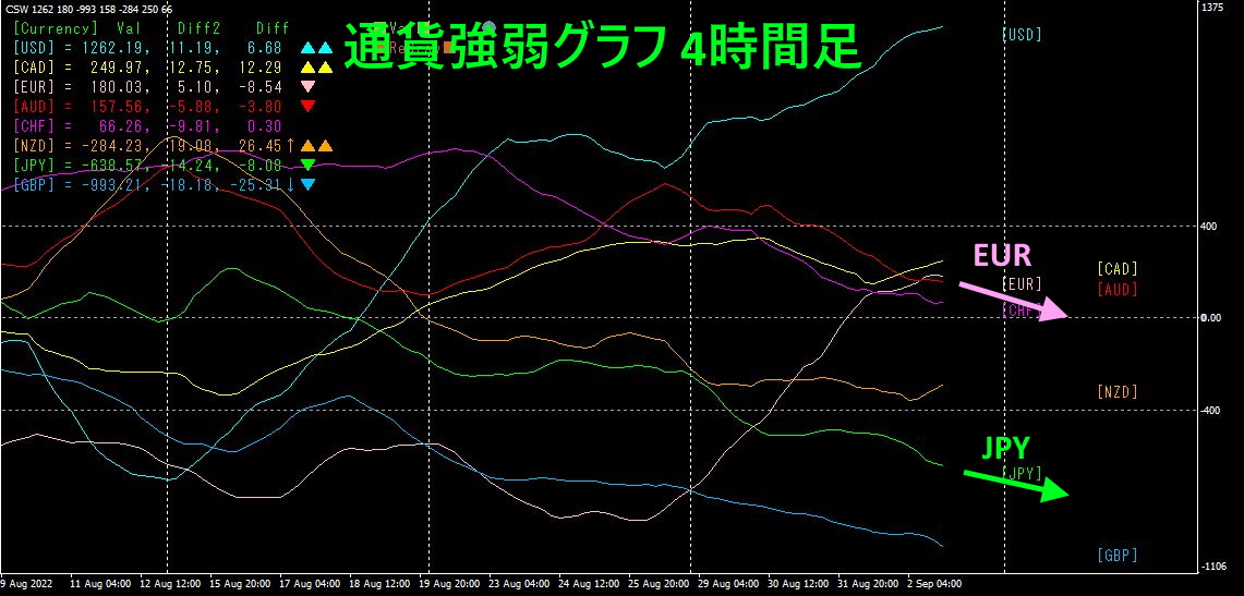 先週末までは、4時間足で見て最も弱い通貨がEURでした。しかし、今週に入ってから、EURがどんどん強くなり、グラフの傾きも急角度で上昇してきました。週の後半からは、上昇の角度が鈍っています。