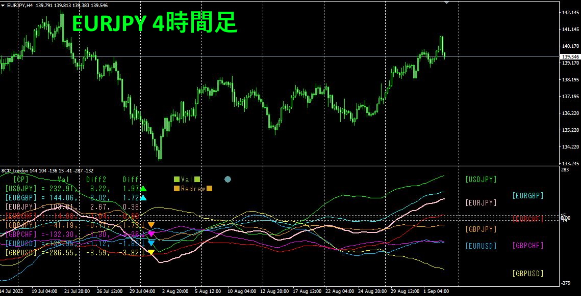 EURJPYの4時間足のチャートを見てみましょう。下半分が「8CP見える化インジケータ」のLondon版で表示したものです。ピンク色の太線がEURJPYのグラフです。