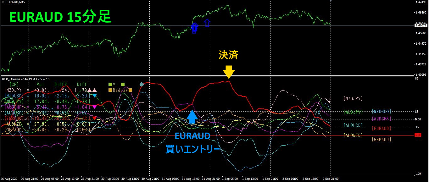 上半分は、EURAUDの15分足チャートです。上半分の青色矢印は、「28通貨ペア一覧インジケータ」のアラート位置を示します。下半分は、「8CP見える化インジケータ」です。赤色のグラフがEURAUDに相当します。